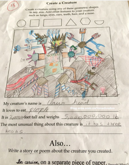 4.创造一个生物:用各种几何图像组合成一个生物,可以在创造的生物上加一些有特点的器官,比如尖牙,眼睛,鼻子,头发,耳朵等等。然后写一个有关这个生物的故事或者一首诗,要用连体的Cursive来写。多多那次选择写了一首诗。